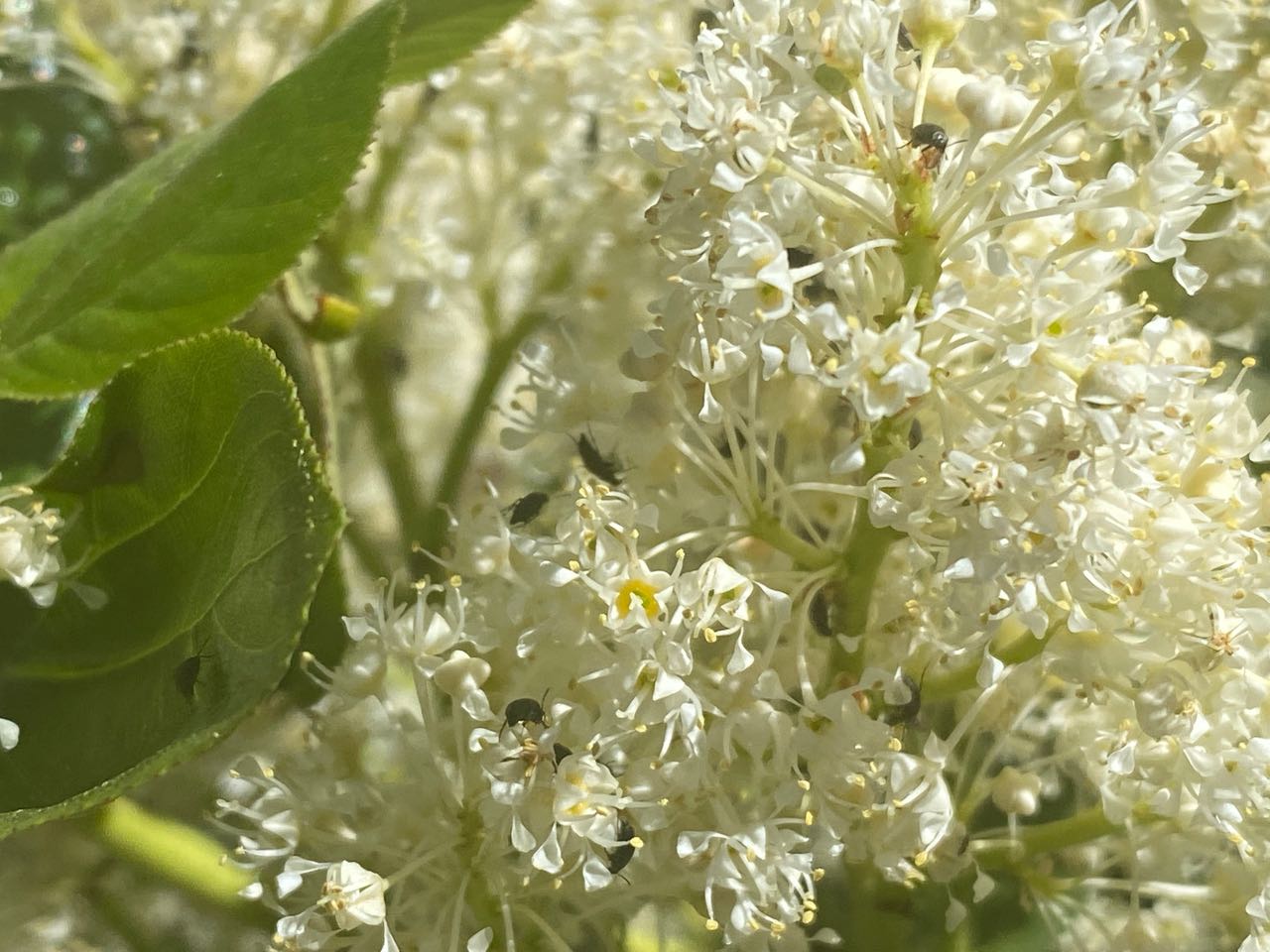 Native ceanothus shrubs are in full bloom, their creamy white flowers like ocean foam above leathery evergreen leaves.Yellow-centered teensy blossoms beckon pollinators smaller than wild rice grains. The scent is at once sweet and musky.