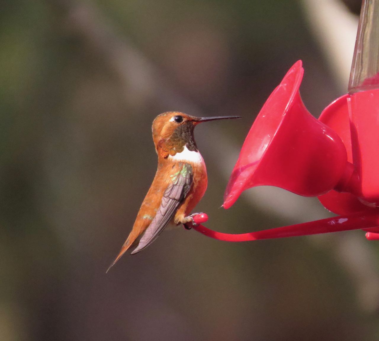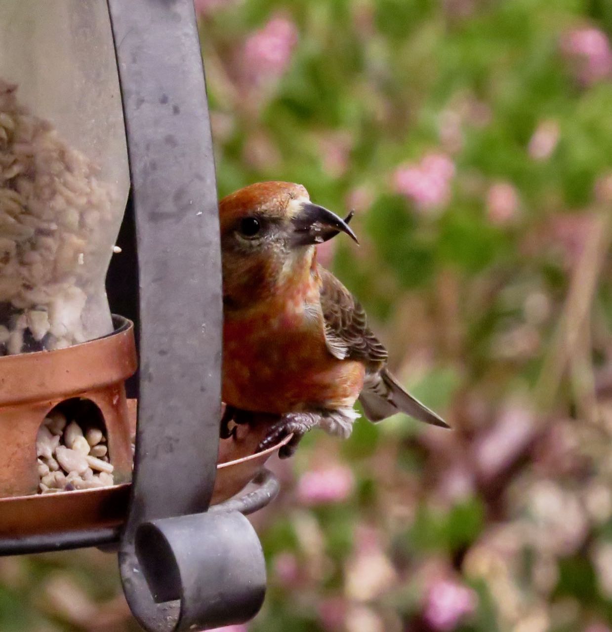 Beyond my shady enclave, spires of purple lupine buzz with native bees of all sizes, stripes and hues. Wasps the color of amber with long dangling legs seek the blooms, too. A rufous hummingbird zings into our feeder– a little spitfire of a bird, always ready to chase away a rival. Next, a red crossbill perches on the long tubular feeder of finch seed, the favorite of lesser goldfinches and pine siskins.