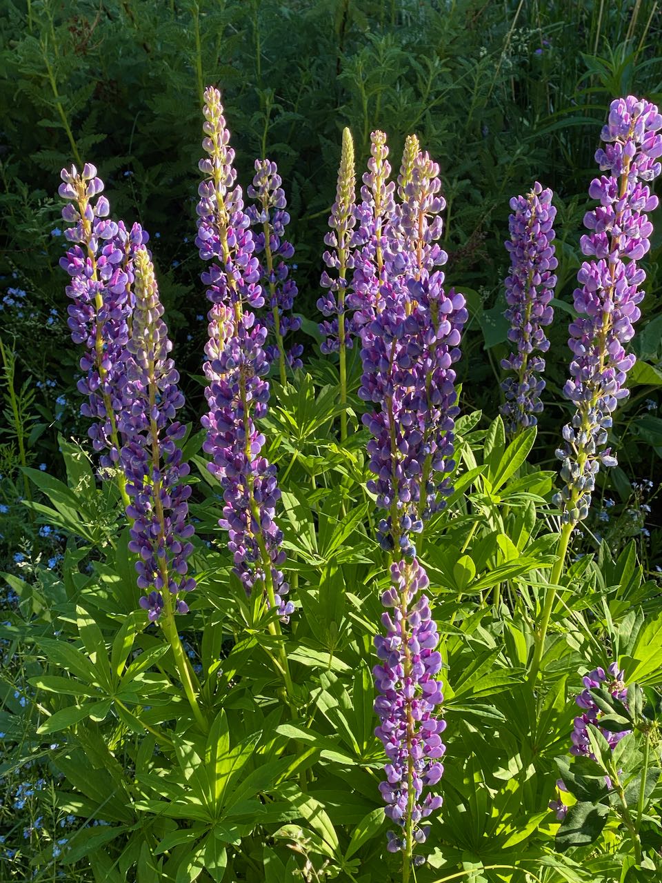 Beyond my shady enclave, spires of purple lupine buzz with native bees of all sizes, stripes and hues. Wasps the color of amber with long dangling legs seek the blooms, too. A rufous hummingbird zings into our feeder– a little spitfire of a bird, always ready to chase away a rival. Next, a red crossbill perches on the long tubular feeder of finch seed, the favorite of lesser goldfinches and pine siskins.