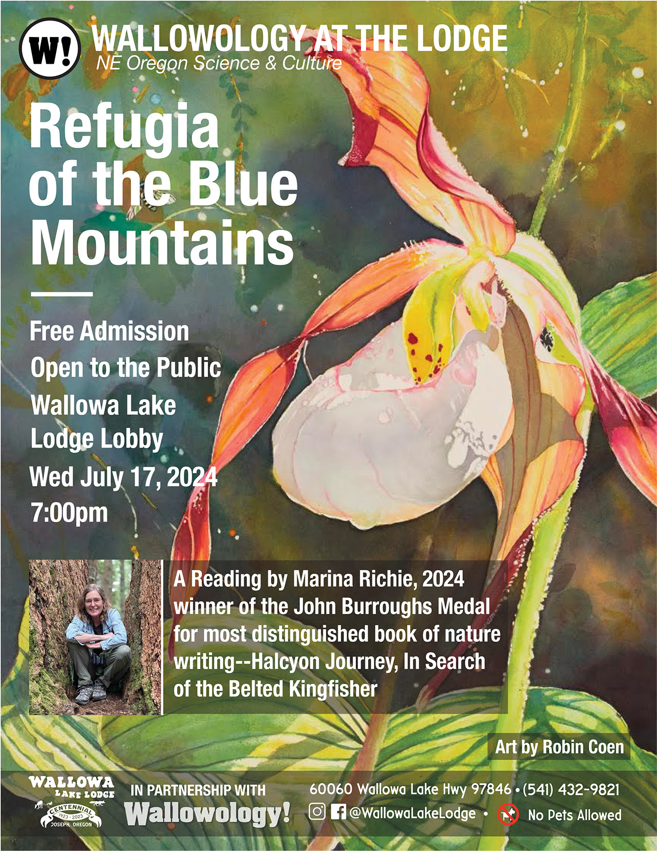 On July 17th, I had the pleasure of giving a reading at the historic Wallowa Lake Lodge, thanks to Wallowology and the Lodge. My prose and poetry accompanied 35 of artist Robin Coen’s spectacular and exquisite watercolors. Our Refugia of the Blue Mountains exhibit opened this past May at the Peregrine Fund’s World Center for Birds of Prey in Boise. Robin and I created our work through the Wild Blues Artist-in-Residence, a new program of the Greater Hells Canyon Council. For upcoming showings and to learn more about the residency, please visit Wild Blues Artist-in-Residence. The opening starts with this piece, A Storied Wind Reveals the Way of Beauty. I’ll include three poems at the end to go with paintings.