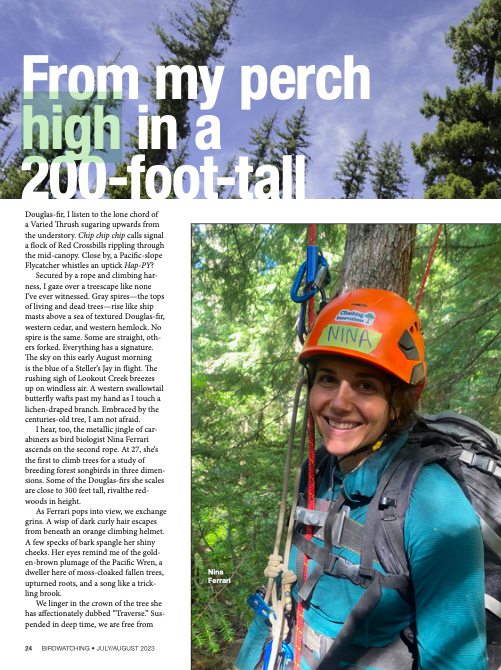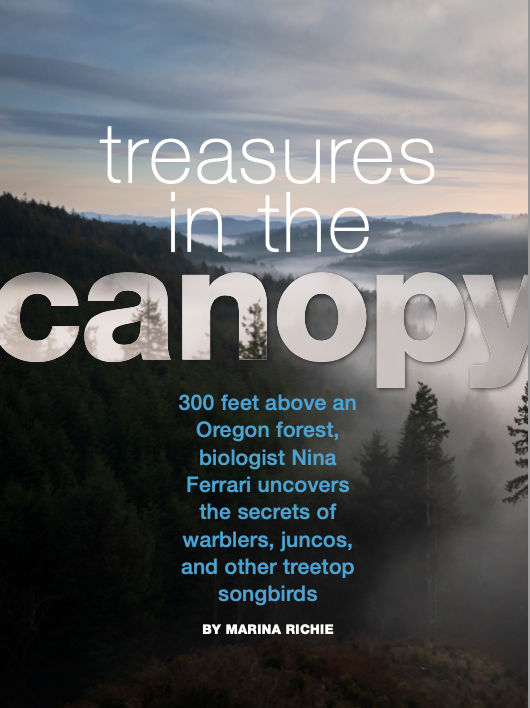 The article I wrote for Birdwatching on Nina Ferrari climbing towering trees and studying birds in the H.J. Andrews Experimental Forest came out this month: Treasures in the Canopy. However, a new company bought the magazine and the owners promptly fired the staff, and ended this important and wonderful publication. My piece had long been scheduled, but the last issue where it appears digitally only is the result of a makeshift fill-in staff without experience. While my text is intact, some of the photos and captions are problematic. The good news is that the former editor Matt Mendenhall has moved on to edit American Birding Conservancy’s magazine. They are lucky to have one of my favorite editors and a strong voice for birds and habitats in trouble.