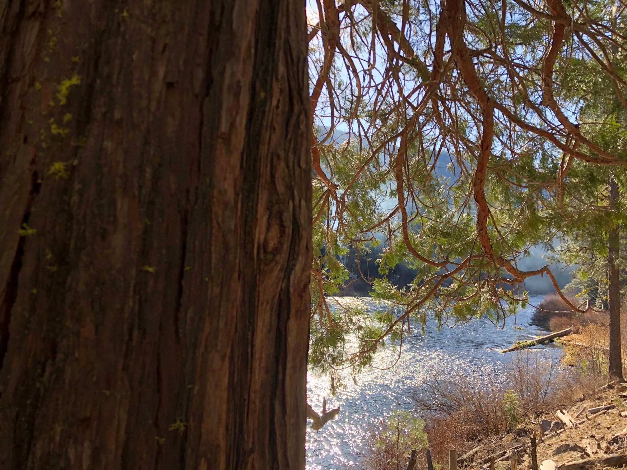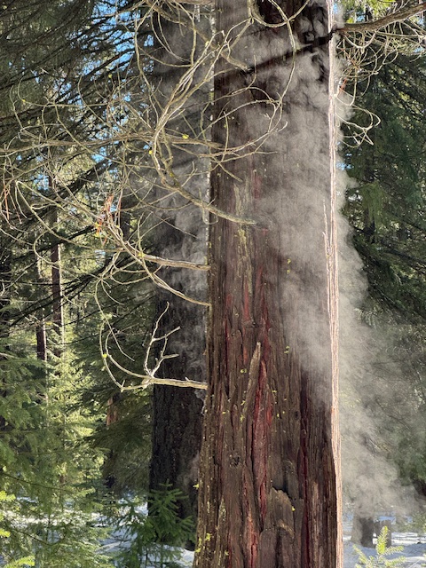 Returning to the riverside of the singing dipper on the next morning, the sky is clear. I pause by a cedar and ponderosa fused at their bases and living this way for centuries. Nearby, a lofty ponderosa pine forks forty feet up and then splits into six vertical trunks. The day is warming. Mist rises from the Metolius. Trees wet from melting snow are misting, too. Breathing. Exhaling. A dipper lilts into a jazz riff.