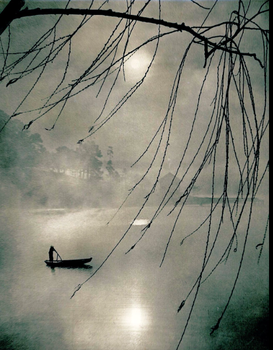 The mist sighs his longing. Balancing upright in a seedpod boat, he dips his pole and glides across dark waters. Droplets mingle with tears. Soon he will slip into the pearlescent path of the sun. He loves the way fog feathering away at dawn lifts him closer to the spirits of his ancestors. The way the breeze sifts the dangling tree limbs. Here in this ephemeral limbo, he is no longer grieving. No longer cleaved from his mother and grandmother. From across the bay, a kingfisher plies her radiant wings of turquoise. Arrowing toward him like a loosened shard of a rainbow, the halcyon bird gifts him with a whistled phrase. Happiness roots first in his fingertips, twines up his arms, leafs across his body, and blooms. He is the lotus floating in the arms of the sunrise.