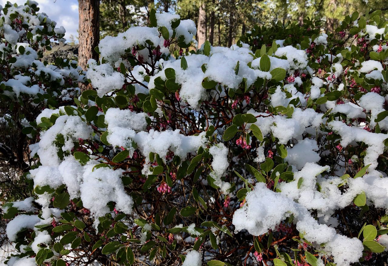 How often do we breeze in and out our doors without stopping to notice first buds, first leaves, first flowers, first butterfly, or first bluebird? As we all come to accept this new and terrifying reality of the coronavirus, we at least have Spring, or a version. This morning, we woke to snow on blooming manzanitas.