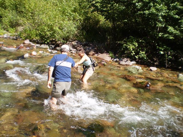 Lisa and Paul were up for the task on a sleeveless-shirt day in August. Armed with a shovel and measuring tape, we crossed the swift yet shallower creek. First, we calculated the hole’s distance from the top of the bank down, at two and a half feet. Next, Paul extended the tape measure into the hole and tunnel to record four and a half feet of hard-won slightly ascending excavation.