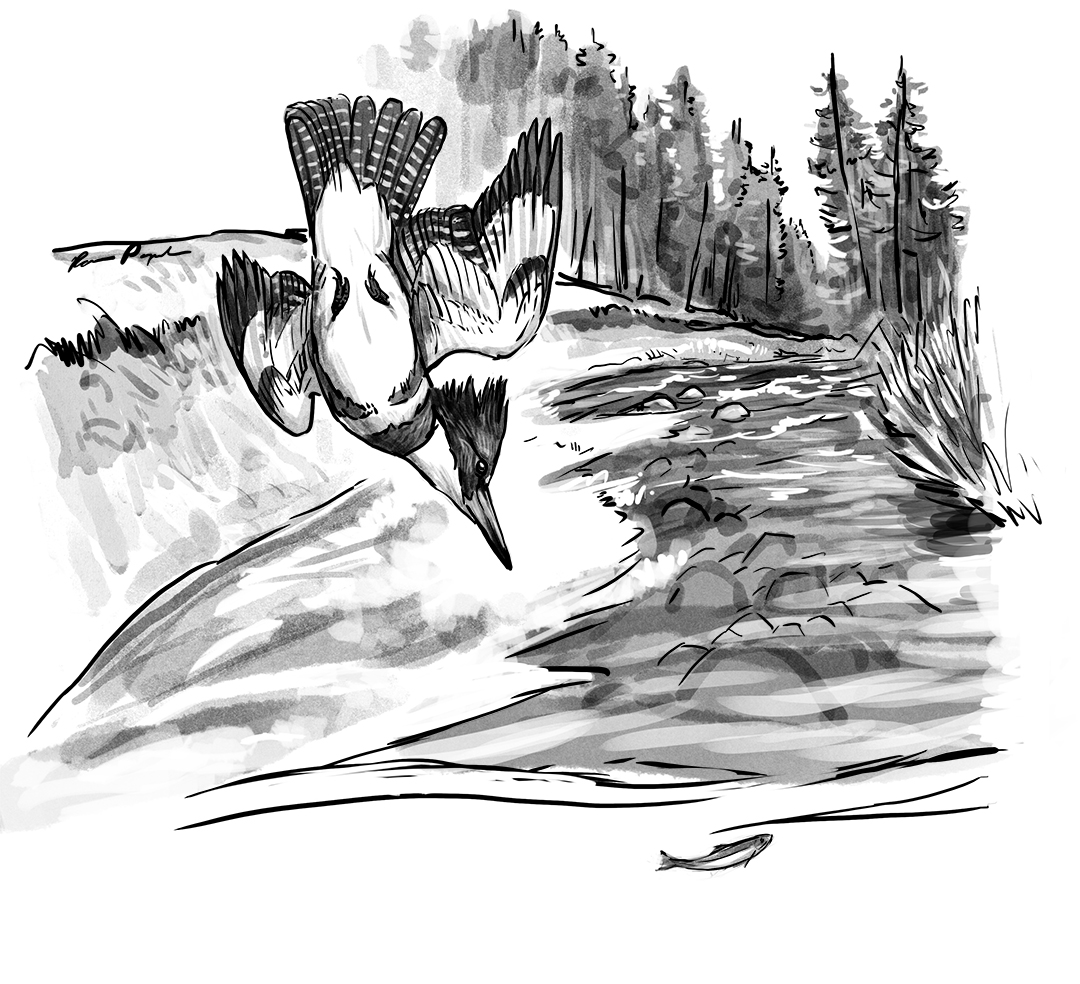 Each time a kingfisher landed on this boulder, I’d hoped to escape those penetrating black eyes, even as my brown eyes drank in the vision of an alert bird in crisp patterns of blues and whites with slicked-back crest and a minnow gripped in a fierce bill.