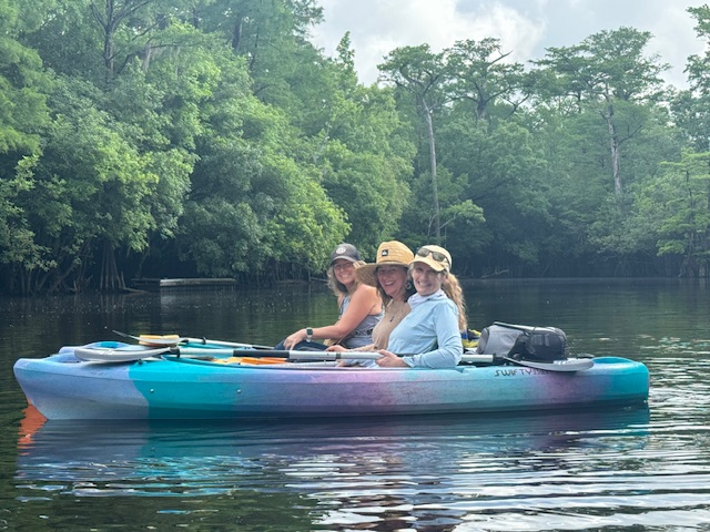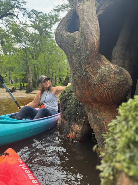 In our last mile on a widening river, rain pours down. We are soaked yet jubilant. A rumbling truck ahead signals time winding forward to the present. Easing out of our kayaks below a bridge, we reenter our noisy lives with spirits cleansed. But first is the reality of a shuttle, where eight of us cram into a Subaru Crosstrek. We don’t mind. We’re like turtles piling on cypress knees. Intimacy. Laughter. Camaraderie.