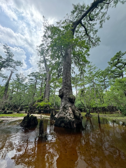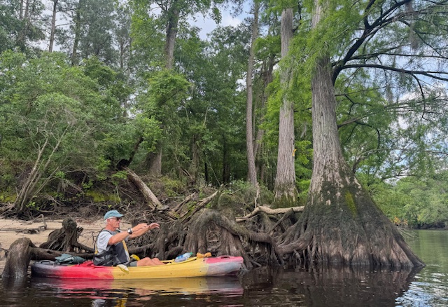 Arrival. We slide kayaks onto a small beach among the oldest cypress. A single Prothonotary Warbler perches on a tree knee within a few feet of our group, tilts his head back and belts out a solo. He flies to another until we are ringed in music. C.R. tells us this bird has a nest nearby in a hole within a cypress knee. Our chorus of human voices chirp in bursts of wonder….fairyland…primeval…Jurassic Park…Amazonian….magic…