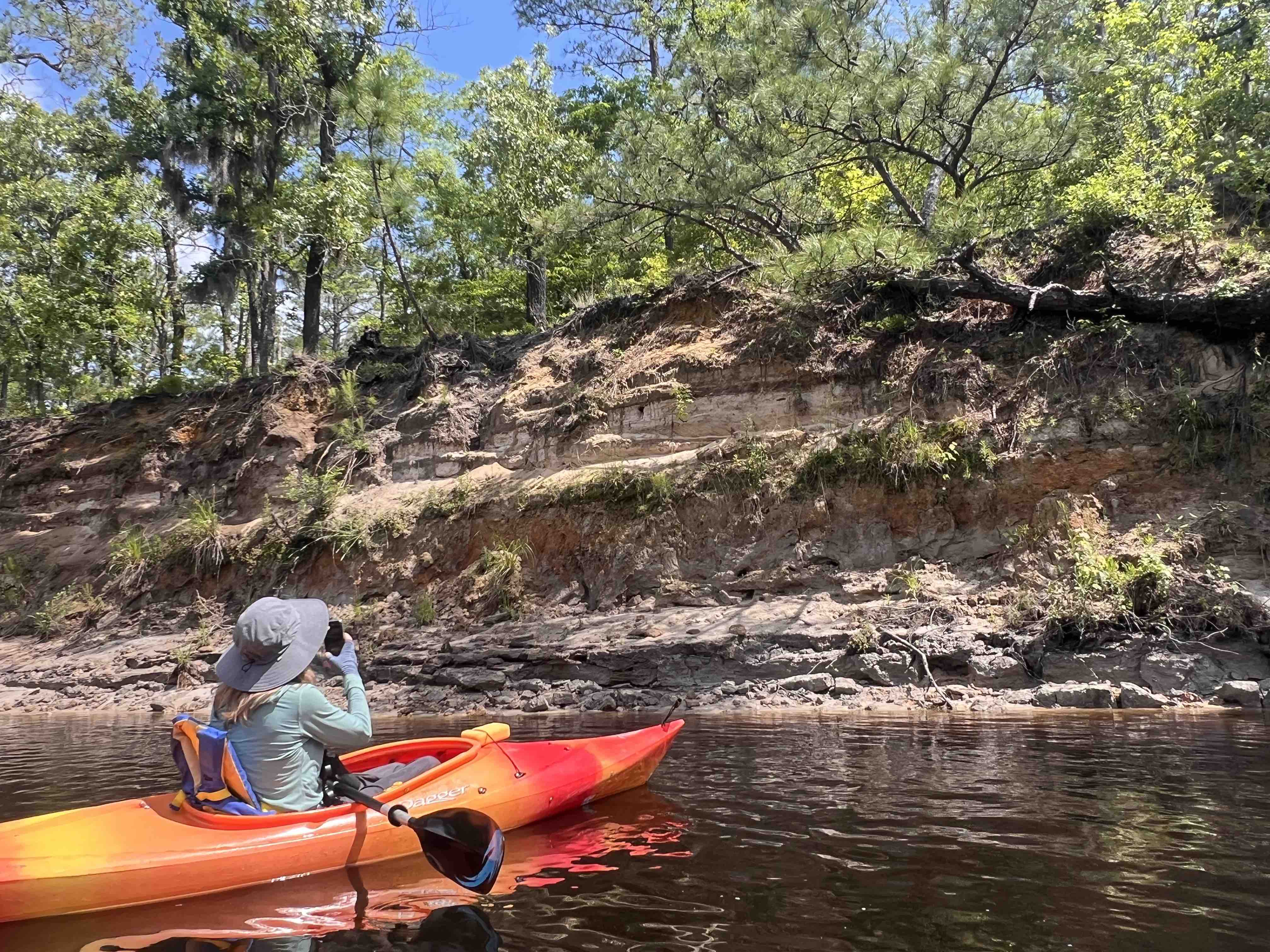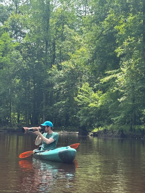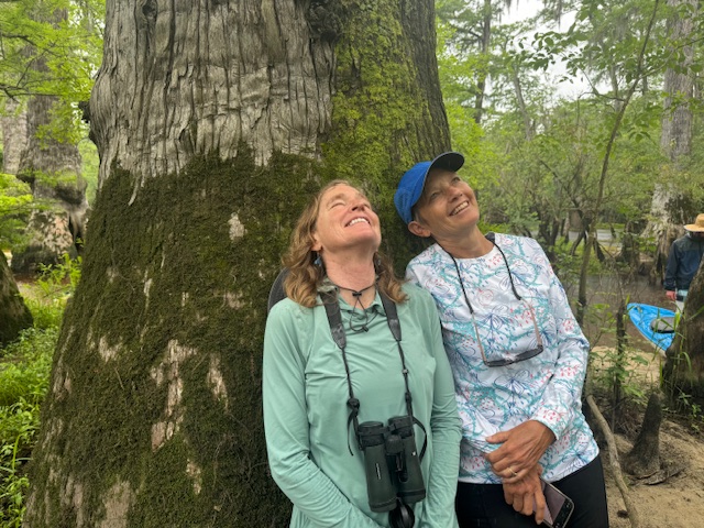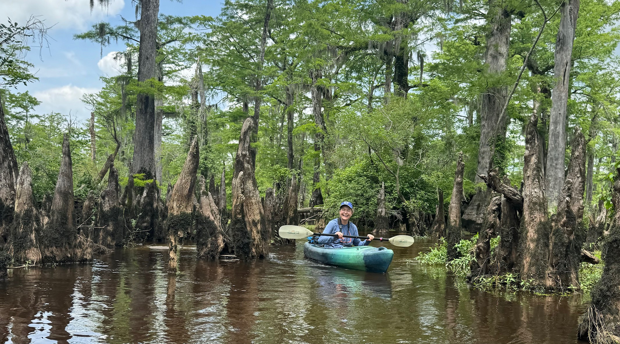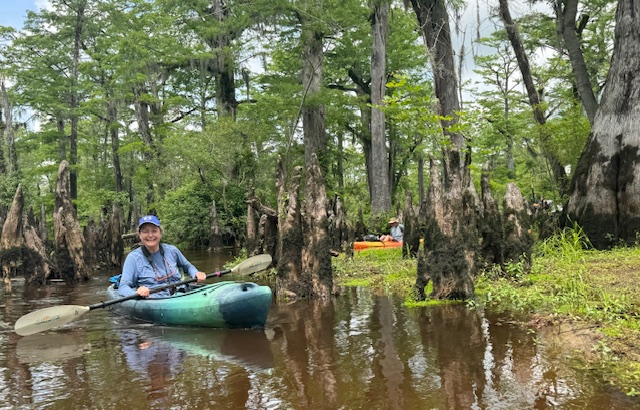 Holding my kayak paddle in a loose grip, I reach forward to dip my right blade and lever with my left hand. Pull through water, lift and then repeat on the left. Awkward at first, I aspire for fluidity. I’m struck by the shimmering leafy diversity of hardwood trees mingling with cypress so wedded to water. Often, I raise my binoculars and drift sideways, falling behind to learn the birds from Howard Ferguson, a retired wildlife biologist with a keen ear.