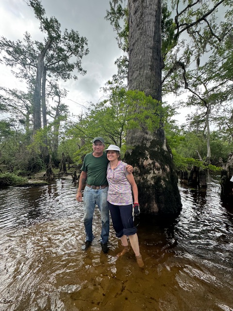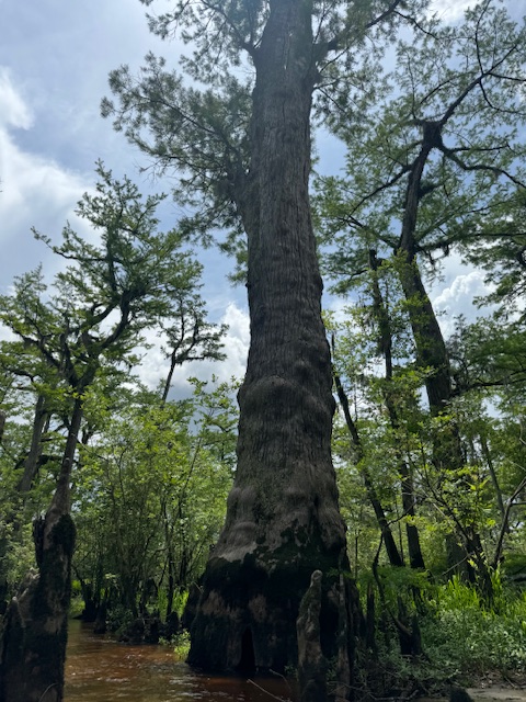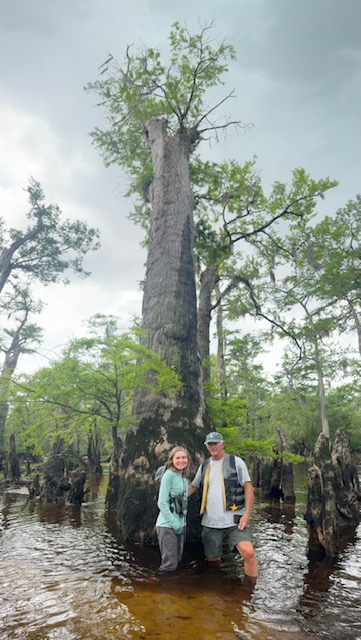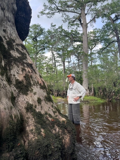 C.R. wades to show us the oldest recorded living bald cypress at 2,626 years, and recorded only in 2018. To find a solid core, dendrochronologist David Stahle climbed ten feet up a ladder to hand drill a tiny hole with an increment borer, which extracts a pencil-like sample showing every ring. Nearby trees may be closer to 3,000 years or even older, yet they hide their age in hollowness.