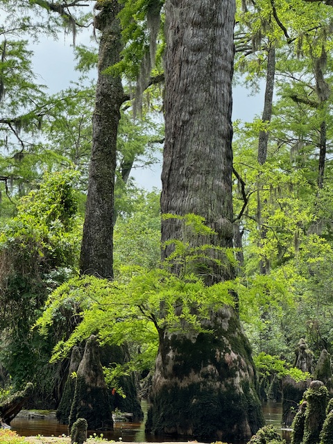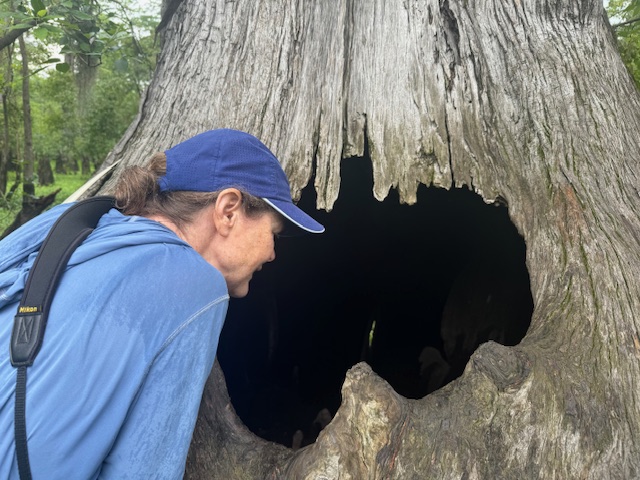 We linger over lunches and wander among reflecting waters. Marvel at the gray striated bark of trunks and burls on trunks. Peer through a gaping mouth into the cave-like trunk. Ponder cypress knees and interweavings of a forest withholding her secrets. Gasp at a cypress split vertically yet still growing as a mossy wall roofed in fine branchlets netted in green.