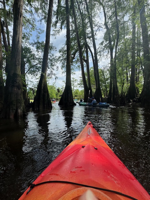 Paddling the Black River, I enter deep time measured in tight rings of slow-growing bald cypress. Our single kayaks form a festive flotilla on dark polished waters. On this early May morning, sunshine splashes through clouds like Prothonotary Warblers flashing yellow plumage.
