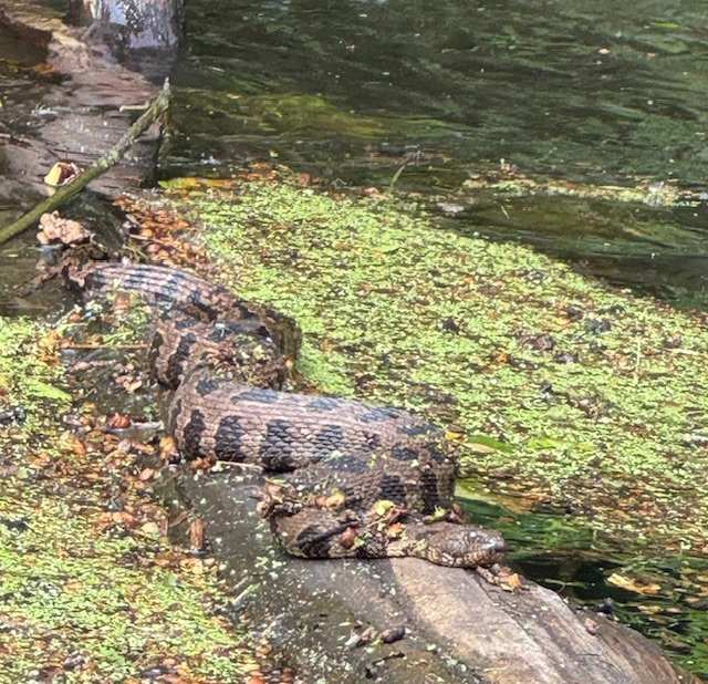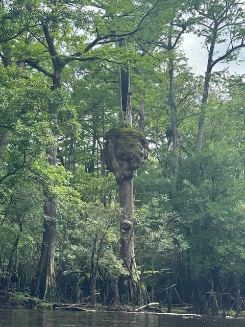 Continuing our downriver journey, we have not left the ancient ones behind or the ringing of birds or the sleeping snakes. I’m dazzled by wavering tree reflections, and one particular cypress with an immense round ball encircling the trunk 20-feet up. I want to fly up and perch on the mossy platform and look up the split open trunk.