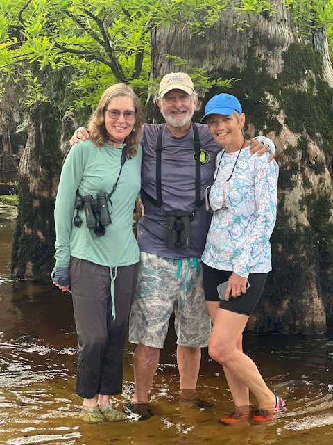 Soon, I’m discerning the spark-bright tweets of a Prothonotary Warbler, the ascending trill of a Northern Parula Warbler, the buzzy vibrato of a Great-crested Flycatcher, and a Yellow-throated Warbler’s clear falling notes with an uptick ending. Our youthful assistant guide Eric stays back, too. He has a gentle knack for herding stragglers, along with other talents like African drumming on cypress knees.