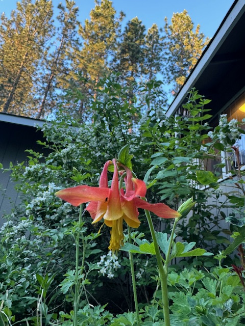 By our kitchen window –the lushest, shadiest nook–mock orange spilled fragrant late June blossoms above columbines, spirea, native mountain hollyhocks, and ferns. Hummingbirds sipped columbine nectar. Yesterday, the quail took cover there. Lesser goldfinches swayed on sunflower stems.