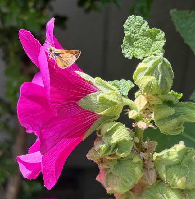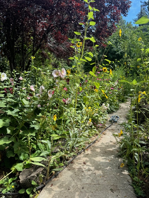 Despite drought and heat, most of our garden is faring well–with a little supplemental watering in places. When home, we also fill feeders and supply freshwater bird baths daily. When away, we offer water in a bucket filled with stones kept fresh with a dripping hose.