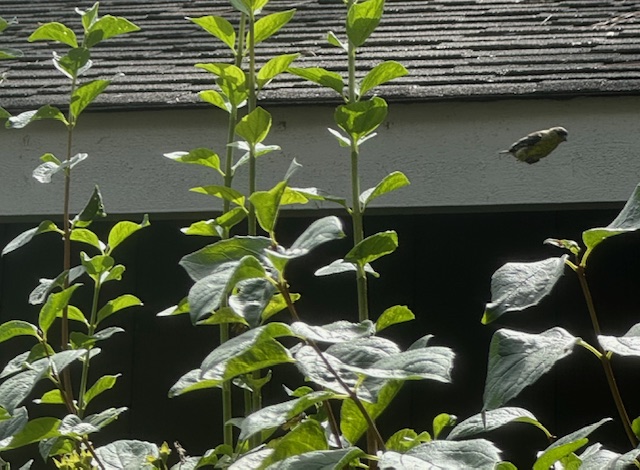 Check out this lucky photo catch.A lesser goldfinch aims for the feeder–wings closed for a moment before the next flap. (Those are mock orange stems in foreground).
