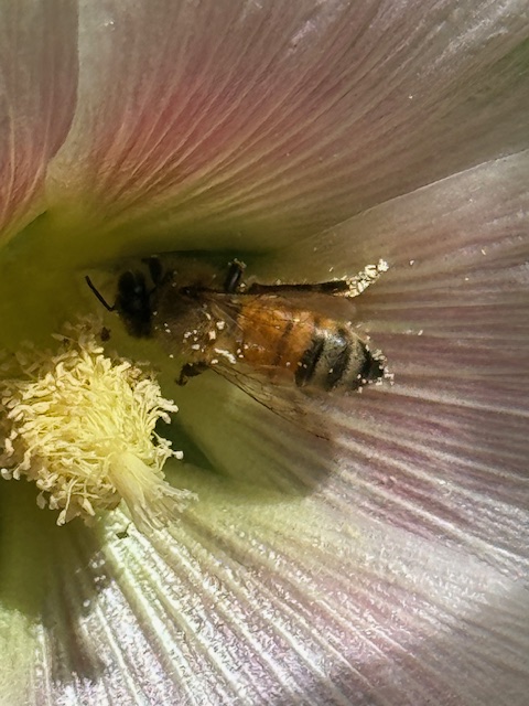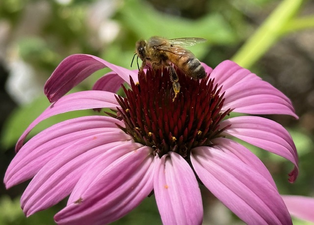 Honeybee on cone flower (front yard walkway, August 20, 2024).