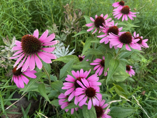 But here’s the rub. Some plants take over. Our yard brims with native goldenrods (just coming into bloom) purple asters (fall flowering), and evening primroses.In Spring, I dig up some to move or give away. Lupine, penstemon, blanketflowers, and brown-eyed Susans persist well too. Sunflowers (spread by birds) typically tower throughout the yard, but this year are coming up in two main patches.