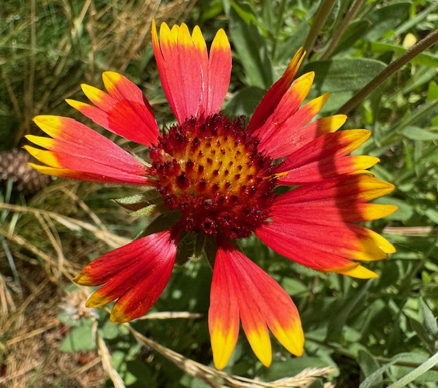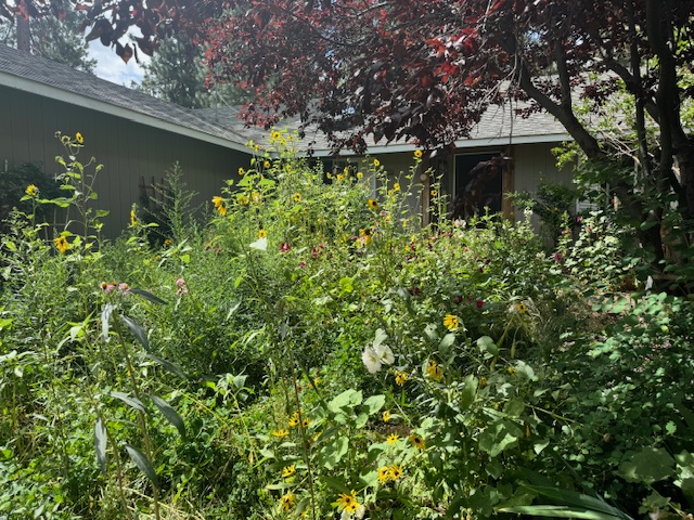 Our nemesis? Lawn grass! Pull. Yank. Pile. Sigh. Grumble. There’s always tending to be done. Some plants that I thought were flowers grow into unidentifable-to-me weeds with sticker seeds. Yet, in the tending there’s immersing in thickets among butterflies, bees, and songbirds. Sagebrush lizards scamper among lava rocks. So do chipmunks. Native gray squirrels and Douglas squirrels leap among trees. This year, a cottontail rabbit has found the garden. Sometimes, a Cooper’s hawk or sharp-shinned hawk drops in to hunt for a songbird meal.