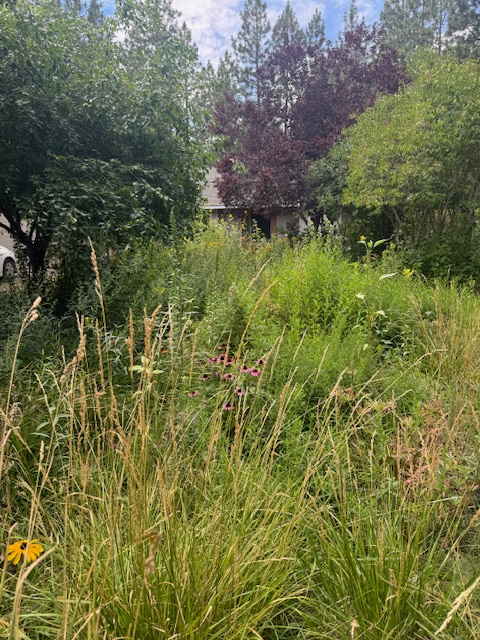 Our rewilding project began in 2017 (See Our Garden for Wildlife in Photos) with digging out old lawn, thistles and cheatgrass, adding soil, transplanting bunchgrasses, choosing native plants from Wintercreek Nursery, and sprinkling wildflower seed mixes. The additions merged with our existing native manzanita, ceanothus, and ponderosa, and non-native plants– from hollyhocks to lilacs and fruit trees.