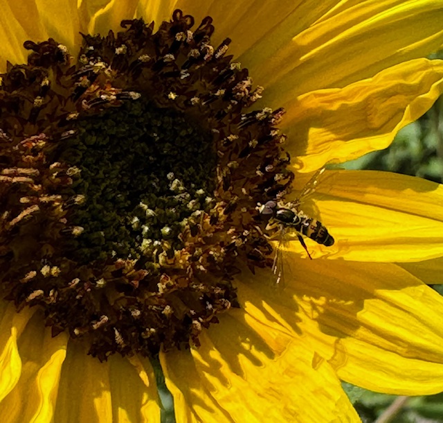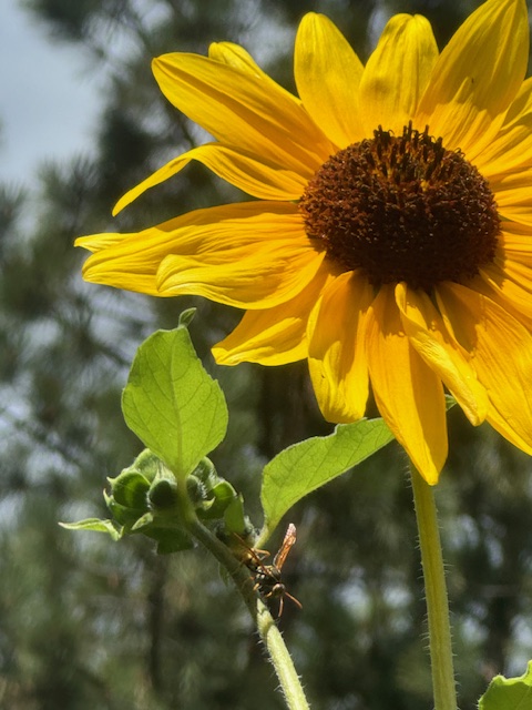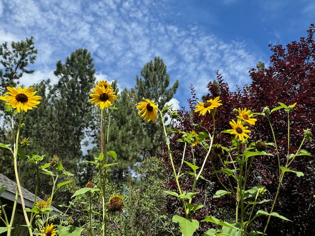 Sunflowers grow from seeds spread by birds. They rise up near our front walkway beaming beauty skyward and beckoning bees and wasps.
