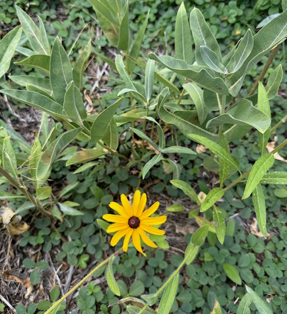 Wild strawberries spread beneath native milkweed (with brown-eyed Susan).