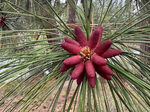 a male pine cone bursts from ponderosa