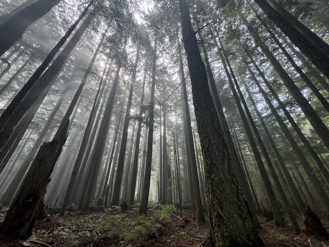 Curtaining mist lifts higher on the ridge. Hermit Warbler