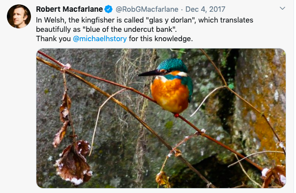 No sign of a kinfisher, yet the Welsh comes closest to honoring the poetry of the bird Europeans know that in plain boring English is the Common Kingfisher. Glas y Dorlan translates to “blue of the undercut bank.”