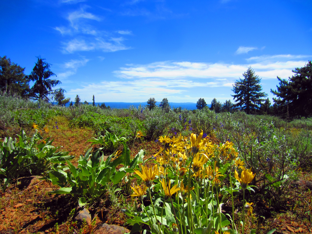 Spring wildflowers trickle like snowmelt from Lookout Mountain. Blooms will slowly flood sagebrush meadows in lupine, paintbrush, penstemon, and scarlet gilia throughout the summer. Here, elk shelter within shady fir and pine forests. Pileated woodpeckers drum on life-giving dead trees. Colossal ponderosas grace the lower ridges. Juniper and mountain mahogany sculpt rocky outcrops. Songbirds bustle among leaves of aspen and alder by streams. Hawks, eagles, and ravens draft the shoulder of an open summit.