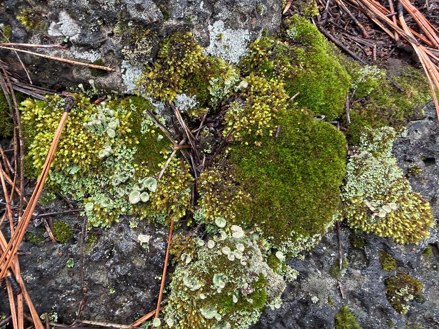 I may head out the door wearing one earring instead of two, but I do strive to practice attentiveness to the natural world. It is only through focus and slowing down that we can be aware. In our awareness, we know to be alarmed by the unraveling of ecosystems from logging, mining, overgrazing, development, and climate change. To notice is to be a participant, as I was one recent morning on hands and knees immersed in a miniature garden of moss and lichens on a lava rock in the pines behind our home.
