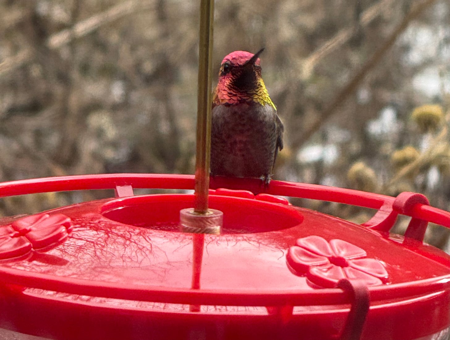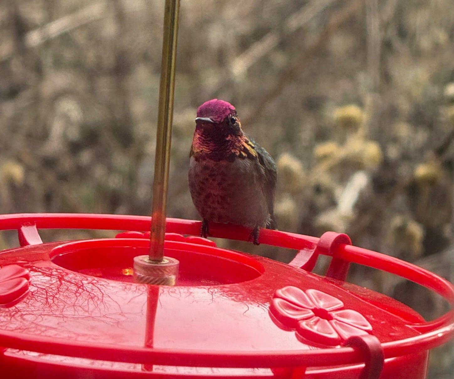 In the turmoil of terrible news—ICE raids on people of color who immigrated to America for a better life, masked armed agents throwing protesters to the ground, and the ICE murders of Renee Good and then Alex Pretti in Minneapolis—I am obsessed with one wild bird. As I try to do my part as a protesting, outraged, and horrified American, the attention I give to the Anna’s Hummingbird helps fuel me to continue. He’s becoming my teacher of resilience. The least I can do is return the gift with my daily offerings.