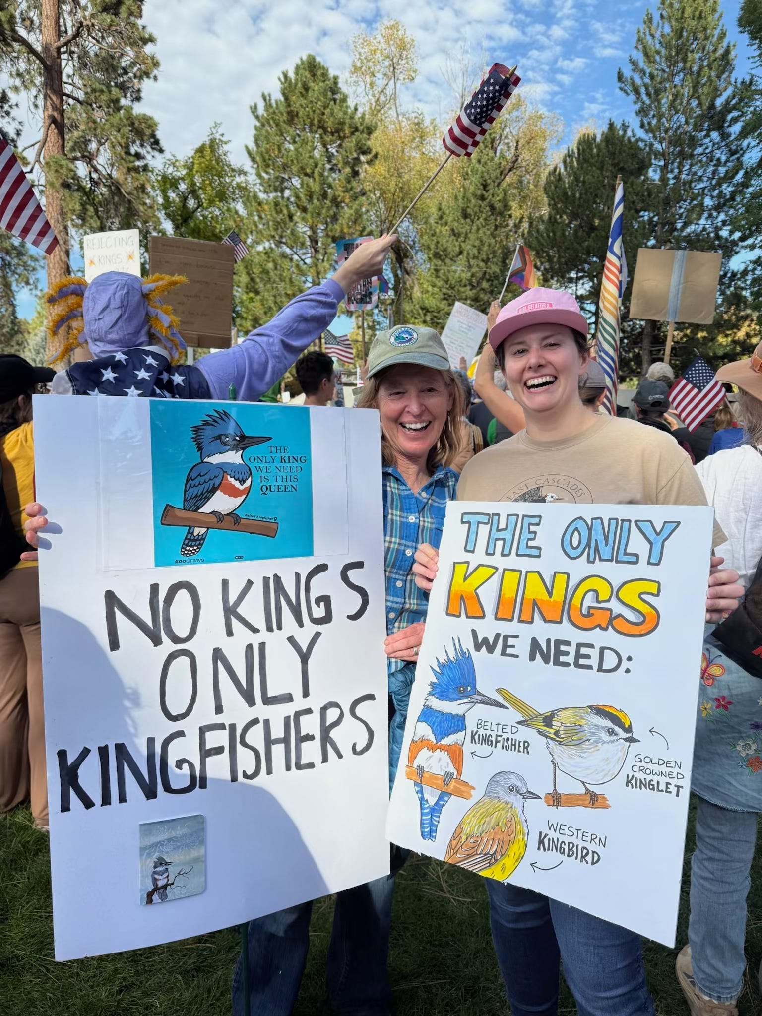 Isn’t it time to realize we are all in this together? Without caring for the planet that sustains us, we will have no future. When we attend to the natural world, we immerse where we belong. In this state of belonging, we find our kin—all who are stepping up. I believe, too, that we must protest it all —the outrage against fellow humans and the more-than-human world. (See photo below from a No Kings Day protest in Bend where I met a fellow lover of kingfishers).
