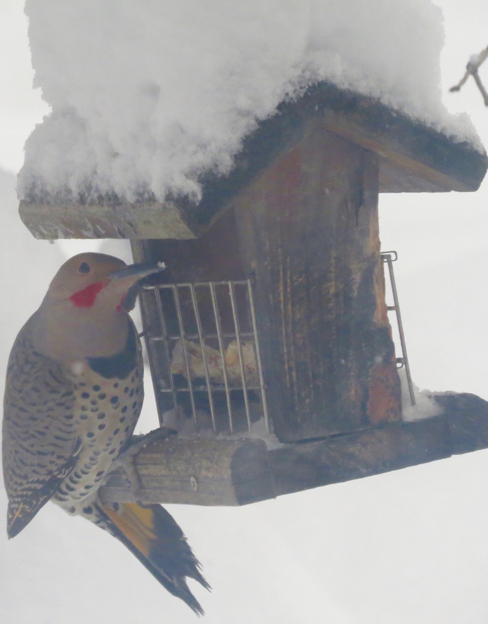 Two flickers, one hairy woodpecker, and one junco in the snowstorm.