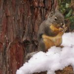 The bibs will arrive in two days. Meanwhile, I’m learning more about our squirrel friends. Doug the Douglas squirrel has the personality of a feisty Dachshund, chasing away the western gray squirrel that’s twice its size. The latter is handsome with a grand flourish of a tail, and is never to be mistaken for an invasive fox squirrel (fortunately there are none here). Doug also terrorizes the yellow-pine chipmunks that zip in and out of the woodpile quickly to avoid his ire. I’m grateful for all three species and our habitat that sustains them. Once abundant, both the western gray and Douglas squirrels are declining overall from loss of big trees and intact mature conifer forests. Just the other day, we noticed a second Douglas squirrel edging its way into the flow, and so far with more acceptance from Doug than I expected — a female?