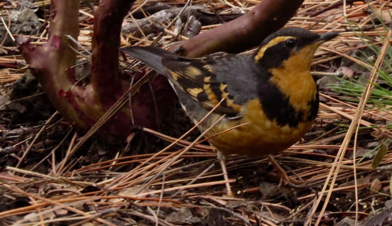 Even a Varied Thrush will give the suet a try, but prefers to hop around the ground near its comrades–in peril from the calico cat that appears about once a day. I have the sliding window above my desk ajar and by just flicking it an inch, the cat hears the sound and evanesces like unwanted smoke.