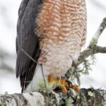She lands three branches down, joining the cacophony of nutcracker taunts. Their subject? A lone Cooper’s Hawk perches on the highest limb. Sleek and gray with a pale reddish barred chest and long banded tail, the crow-sized hawk is not much bigger than the nutcrackers. And yet? This is an accipiter, a predator of birds, and the nutcrackers intend to drive him away.