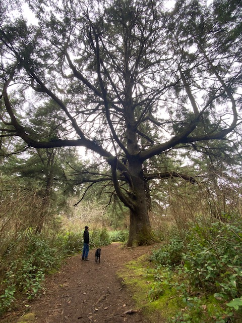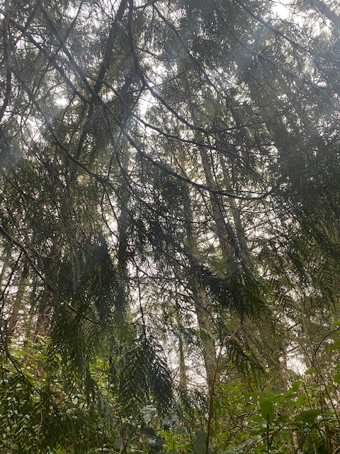 Wes and I bundle up to head out with our labrador Pepper up the forest coast trail in the rain. We wear rubber boots. I twirl a silver umbrella. I want to out-hike the chainsaws, but the air remains snarled until we are almost a mile away. I think of the book I finished recently—An Immense World: How Animal Senses Reveal the Hidden World Around Us by Ed Yong. I’m more attuned to the limits of our own senses and the harm done by all the mechanized roar to the courting of birds, of frogs, and the fragile dance of insect hunters and prey navigating in ways I’d never imagined.