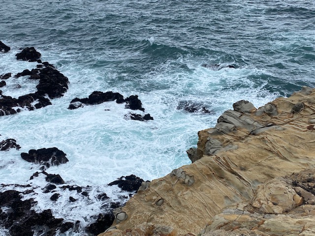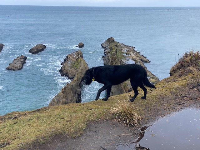 Yesterday, as we’d hiked toward Simpson Reef, we had noticed Pepper acting strangely– whining and anxious, staying close on her leash as if she might steer us to turn around. At last, we heard the chorusing barks of distant California sea lions she had noted long before us. Her ears are sensitive and her nose is a force. A couple years earlier, Pepper had a bit of a close call with a sea lion on the docks of Charleston. She has not forgotten. We took heed and returned to safer ground–from her perspective.