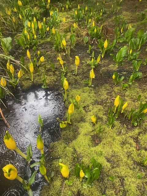 On the return hike, the chainsaws had stopped. We inhabited the quietude of raindrops on fern, salal, rhododendron, laurel, and salmonberry. I bent down to touch the feathered moss on the breast of earth nurtured in cedar, spruce, and hemlock. In the wettest low places, skunk cabbage bloomed yellow candles. Old stumps from past logging had become soft pedestals for trees and bushes. Everywhere we turn is life upon life, decay as nurture. Healing.