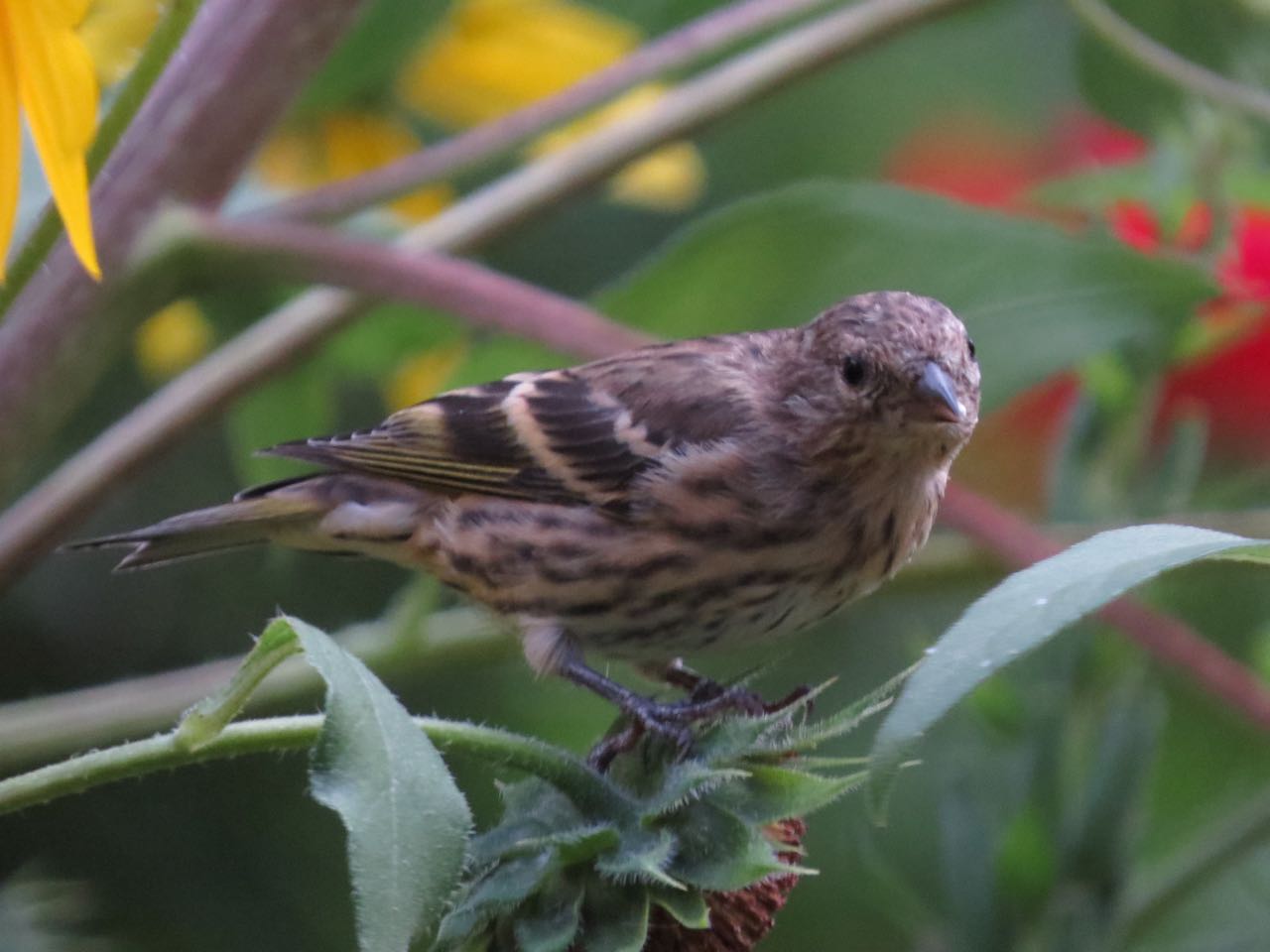 Our front yard sways with sunflowers bending under the weight of Pine Siskins and Lesser Goldfinches that give voice to the lofty plants of September. Siskins punctuate twitters with a rising zeeeeeet! Goldfinches accent clear and quick notes with a descending cheeeeer!