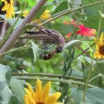 Mountain Chickadees enter the frenzy with their buzzy chick-a-dee–dee–dees. The last of the Rufous Hummingbirds join the fray, too. In a blur of wings, they hover on our now five-foot-tall columbines still blooming by the kitchen window. Each sweet sip adds fuel for migration to wintering homes far south from Oregon–all the way to Mexico.