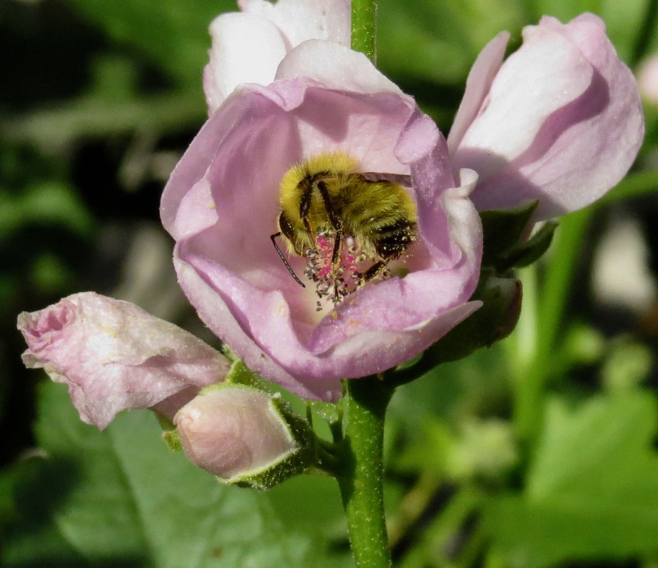 Draping over flowers, the bee limbs go heavy