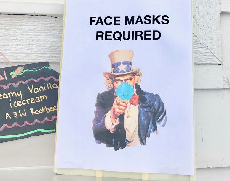 Uncle Sam wearing a blue face mask, his stern eyes blaring and his fingers pointing, “FACE MASKS REQUIRED.”