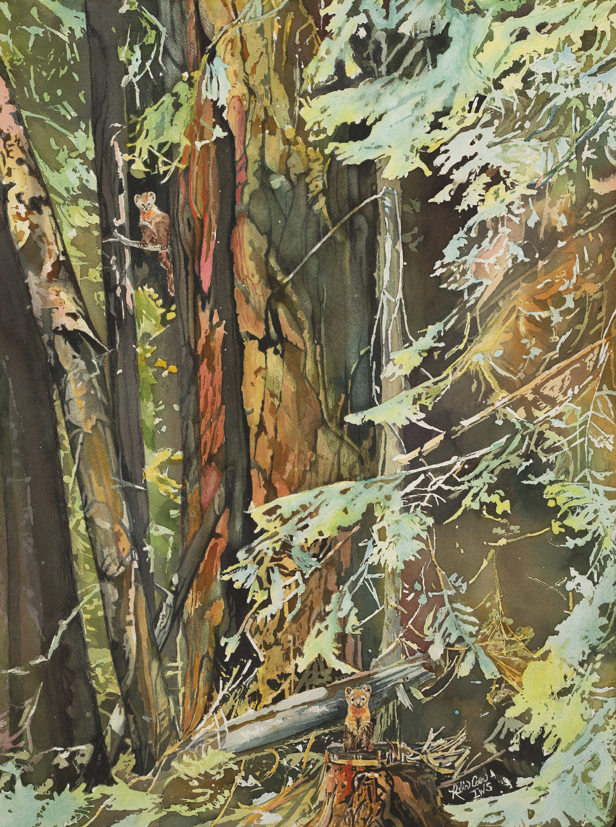 We might call these protected forests “Refugia,” defined as “areas where special environmental circumstances have enabled a species or a community of species to survive after extinction in surrounding areas.” My talented artist friend Robin Coen is in the process of creating a series of art pieces under the title, “Refugia of the Blue Mountains,” as in this art piece of a pine marten teetering on the brink–paws on a stump that could be a harbinger of threats to sheltering river valley forests. (See this Lostine blog).