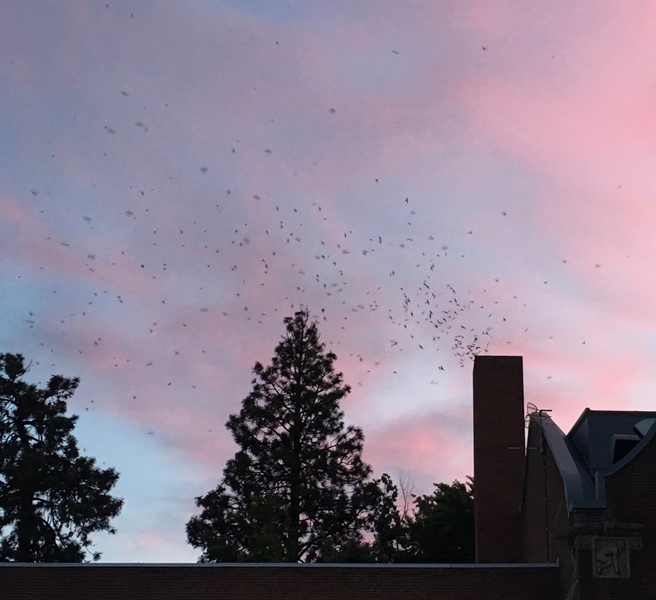 Spiraling inwards to the chimney, one bird flutters down vertically, feet first, and vanishes. The others scatter. Not yet. Too soon. The tempo quickens. More birds. Circling so close their wings seem to flick the edges of the chimney. Three more descend into the night roost. The flock twirls away in an ashy plume. Teasing. Luring and alluring. The sky lights with flamingo colors. Flamenco. Flirtations. And now! The swifts gust in on a wind of their own making. The sky is falling with birds. Still, this pour of dancers into the chimney comes in pulses until the last soloist bids us all goodnight.