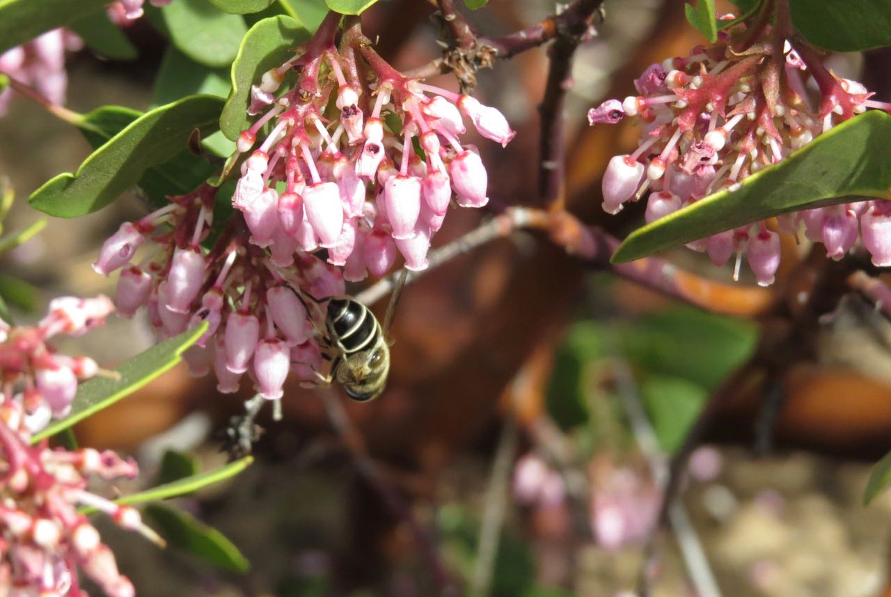 Edging closer to the smooth maroon trunk and shiny green leaves of the manzanita, I see dozens of tiny bees whir from pink coral-shaped blossoms in ephemeral wafts of iridescent green, yellow and black stripes, and translucent wings. Several California tortoiseshell butterflies flare serrated wings the color of flames with dashing black spots and framed in bark browns.