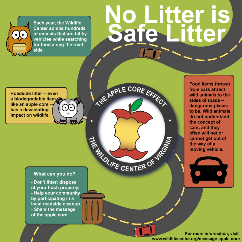 You may think it’s harmless to throw an apple core or other piece of fruit or food out the window. You might even take pleasure in how far you can chuck an apple with a quick flick as you drive at 60 mph. Think again. That apple core attracts rodents and even songbirds to our perilous highways that in turn attracts bigger birds like ravens, hawks, eagles, and owls.