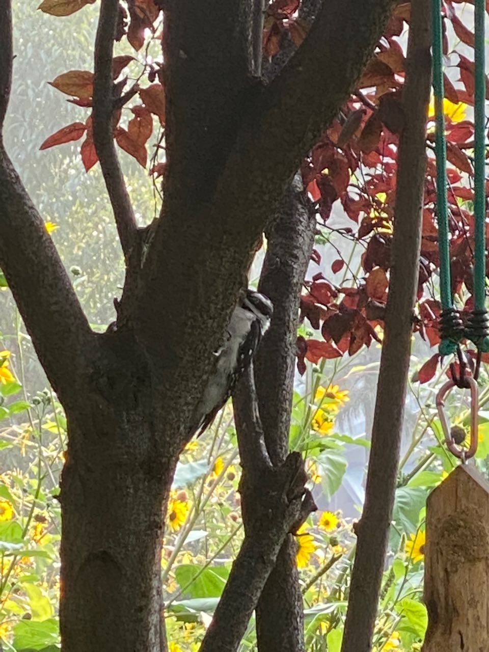 One of my favorite activities is to either stand or sit under the bird feeders surrounded by the jungle. You never know who might come in close, like a chickadee on my Iphone earlier this summer. The other day, a hairy woodpecker gripped a tree trunk —motionless. I slowly backed up to give her more space.
